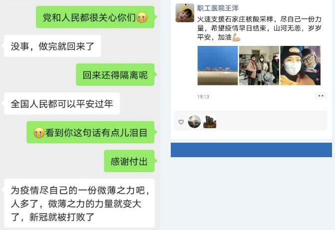 陳思宇是一名職工醫(yī)院的護(hù)士,團(tuán)支部書記,同時也是共產(chǎn)黨員,業(yè)務(wù)能力強(qiáng),責(zé)任心強(qiáng),接到通知后,她表示堅決服從組織安排?!?span id="gbrt3my" class="highlight">唯一有些顧慮的就是孩子還小,從來沒有離開過媽媽。但是家里孩子的奶奶爺爺、姥姥姥爺非常支持,覺得這是一件非常有意義的事兒,他們一定會好好照顧孩子,全家人的支持把我的顧慮都解決了。然后我就特別灑脫的坐上了去石家莊支援的車。”陳思宇笑著說。